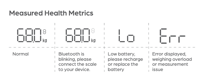The scale can measure and estimate: Weight, BMI (Body Mass Index), Body fat percentage, Muscle mass, Body water percentage, Bone mass, Protein level, Visceral fat, Subcutaneous fat, BMR (Basal Metabolic Rate), Body type, and Standard weight.